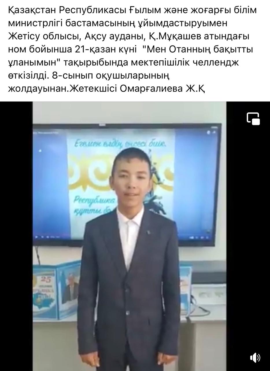 "Мен Отанның бақытты ұланымын" мектепшілік челлендж 8 сынып » "Қ.Мұқашев атындағы негізгі орта мектеп" коммуналдық мемлекеттік мекемесі